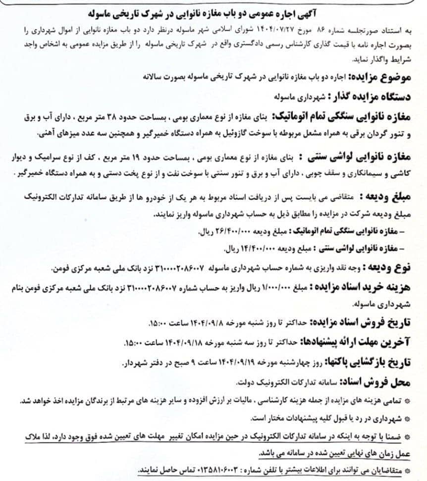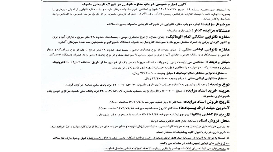 فراخوان عمومی واگذاری دو باب نانوایی شهرداری ماسوله تمدید شد